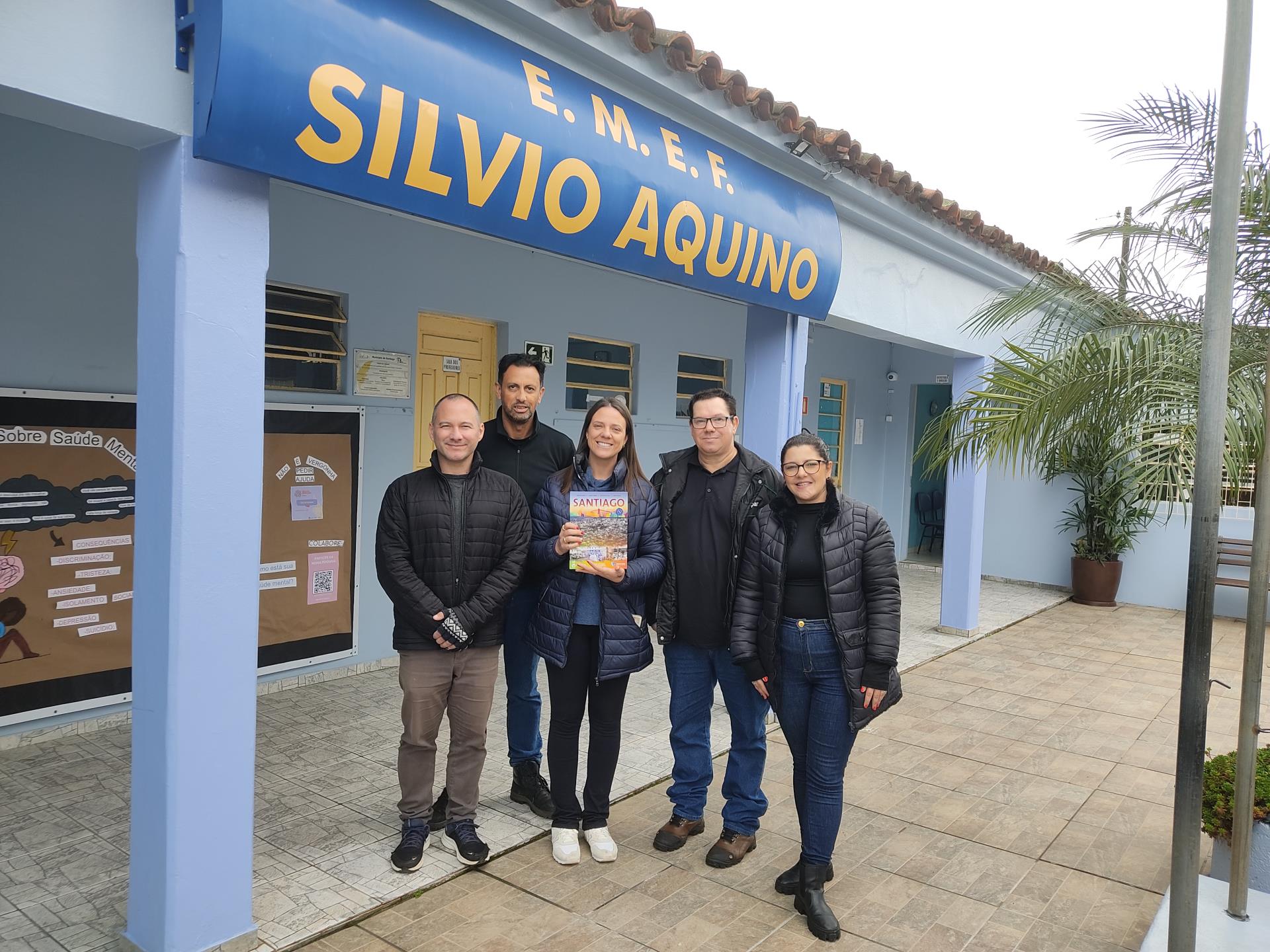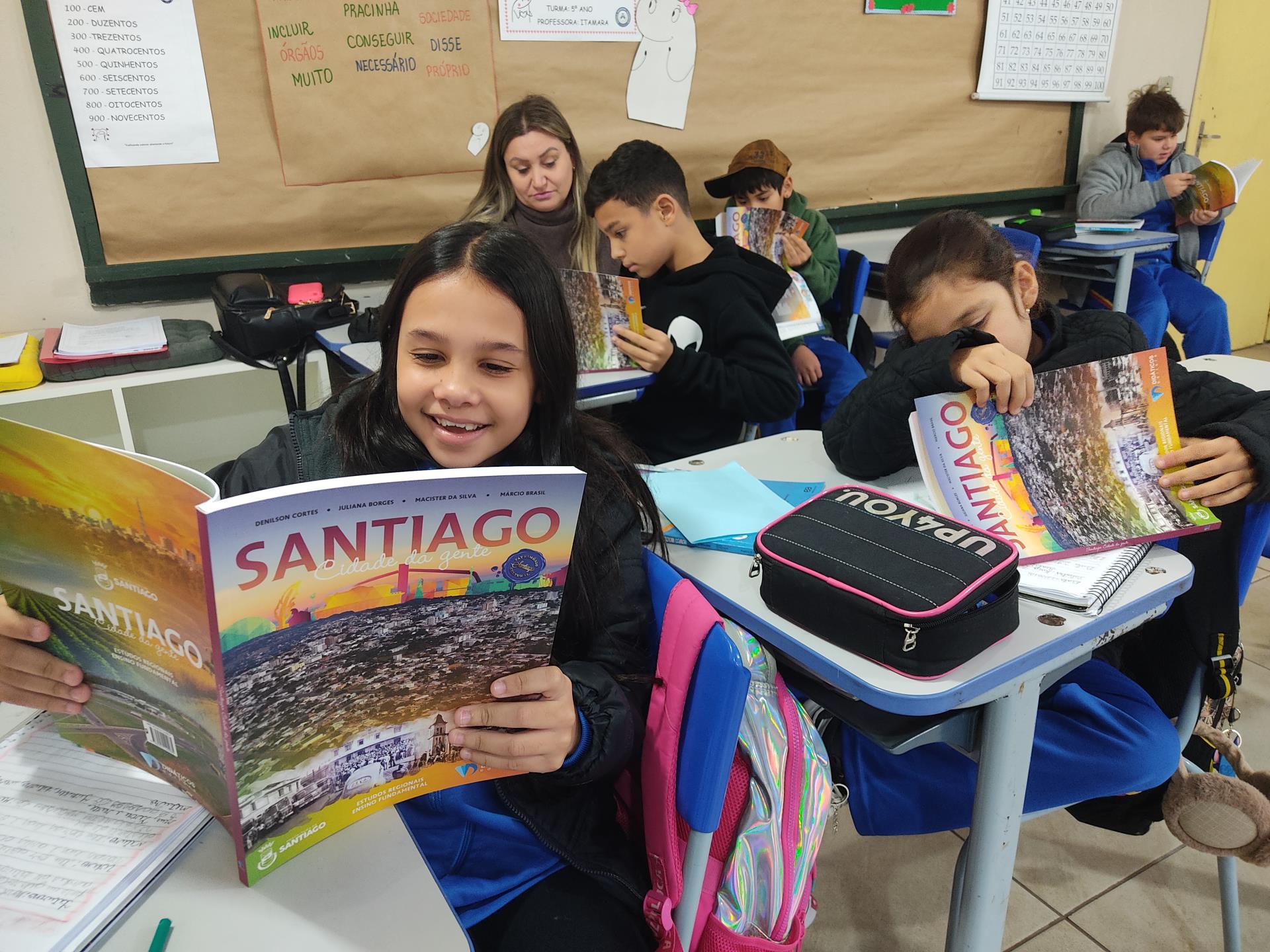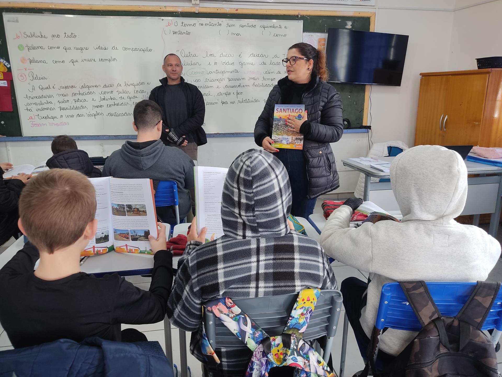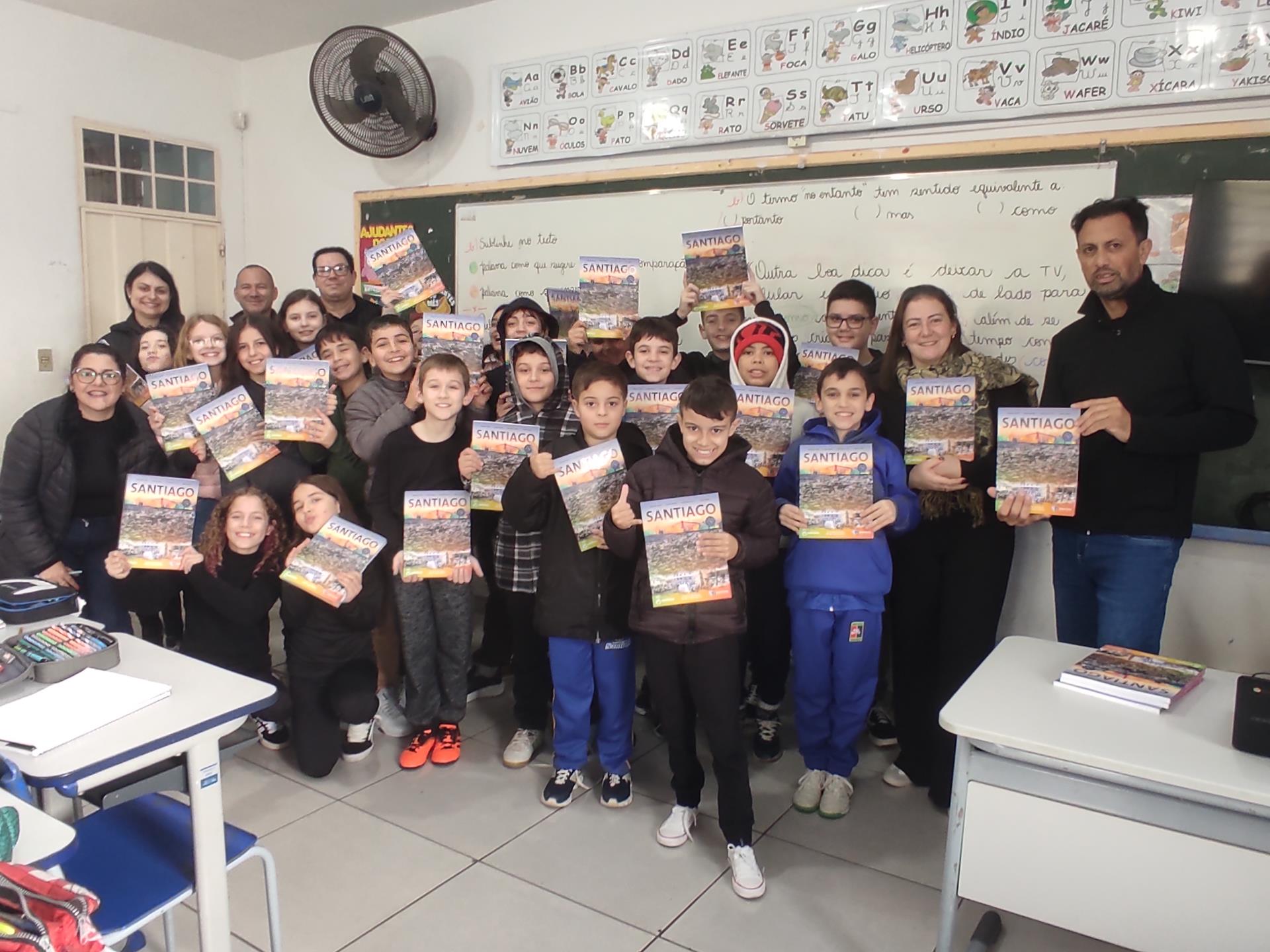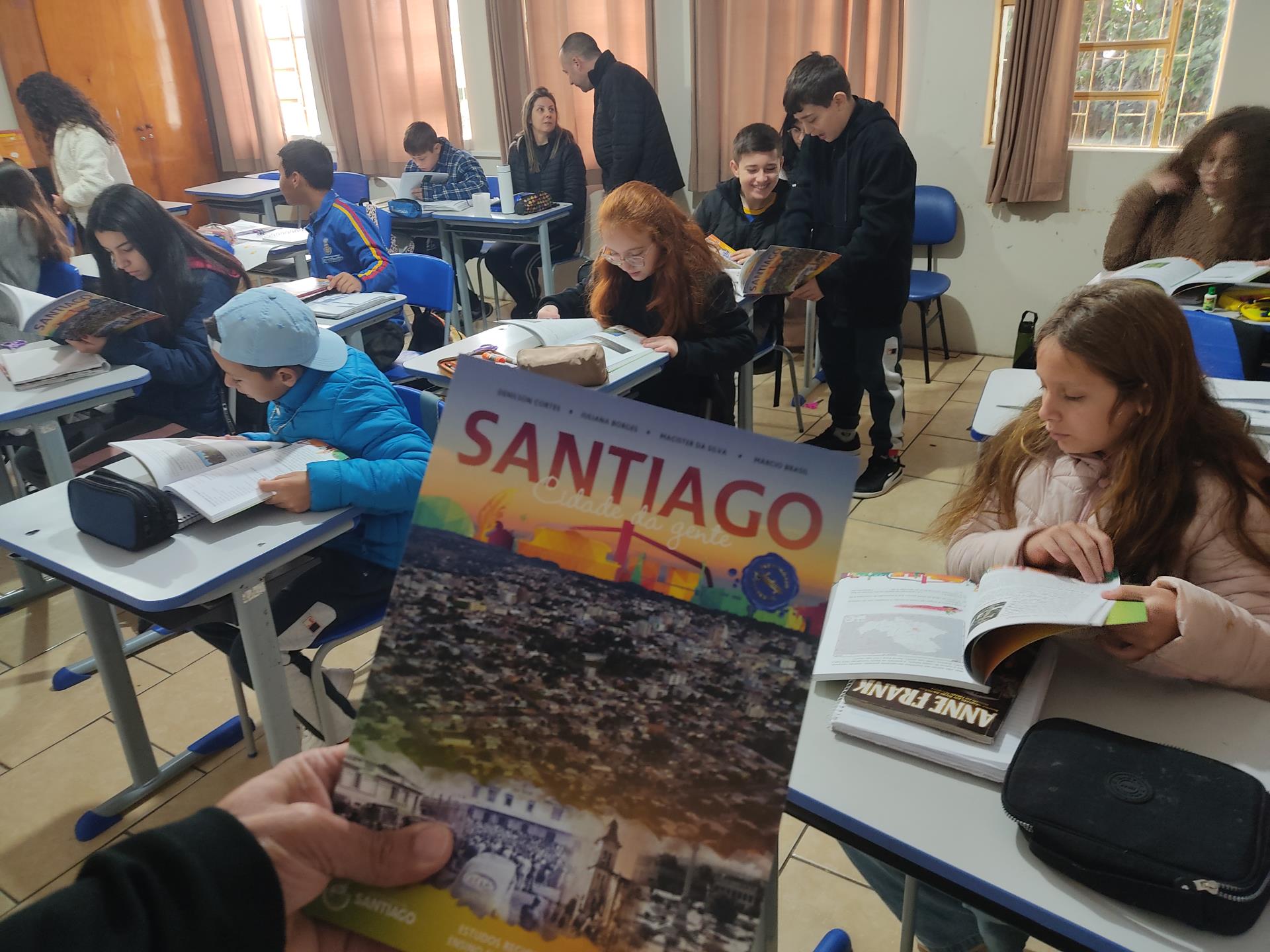 Na quinta-feira, 29, a Secretaria de Educação promoveu a entrega dos livros didáticos "Santiago: Terra da Gente", uma publicação da Editora Didáticos. Os livros foram entregues nas escolas de ensino fundamental Severino Azambuja, Geraldina Borges, Heron Ribeiro, São José, Sílvio Aquino, João Evangelista e Sebastião Colpo, contando com a presença dos autores Denílson Cortes, Juliana Borges, Macister da Silva e Márcio Brasil. O livro oferece muito conteúdo sobre Santiago, desde a história, relevo, hidrografia, lazer, cultura, meio ambiente e muito mais. A obra será trabalhada com alunos dos 5º aos 9º anos. Ao receber o livro em mãos, os alunos demonstraram muito entusiasmo. Na última terça, 28, aconteceu uma formação com os professores das escolas para apresentar a obra e abordar a forma de uso do livro.