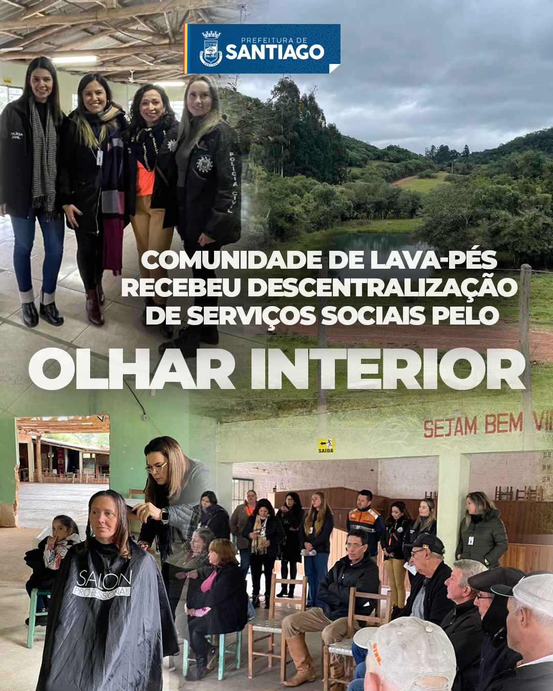 A comunidade de Lava-Pés recebeu na última terça, 28, a descentralização de serviços sociais por meio do programa Olhar Interior. Realizado na Associação Comunitária, a iniciativa mobilizou uma série de serviços, com a equipe volante do Cras, Cadastro Único, Coordenadoria da Mulher, Conselho Tutelar, Polícia Civil, Patrulha Maria da Penha, Defesa Civil e atendimentos médicos, de enfermagem e vacinação contra a gripe realizados pelas equipes do Centro Materno Infantil e da Secretaria de Saúde. Por sua vez, a voluntária Elenara Garcia ofertou cortes de cabelo feminino gratuitamente, o que foi um grande sucesso.