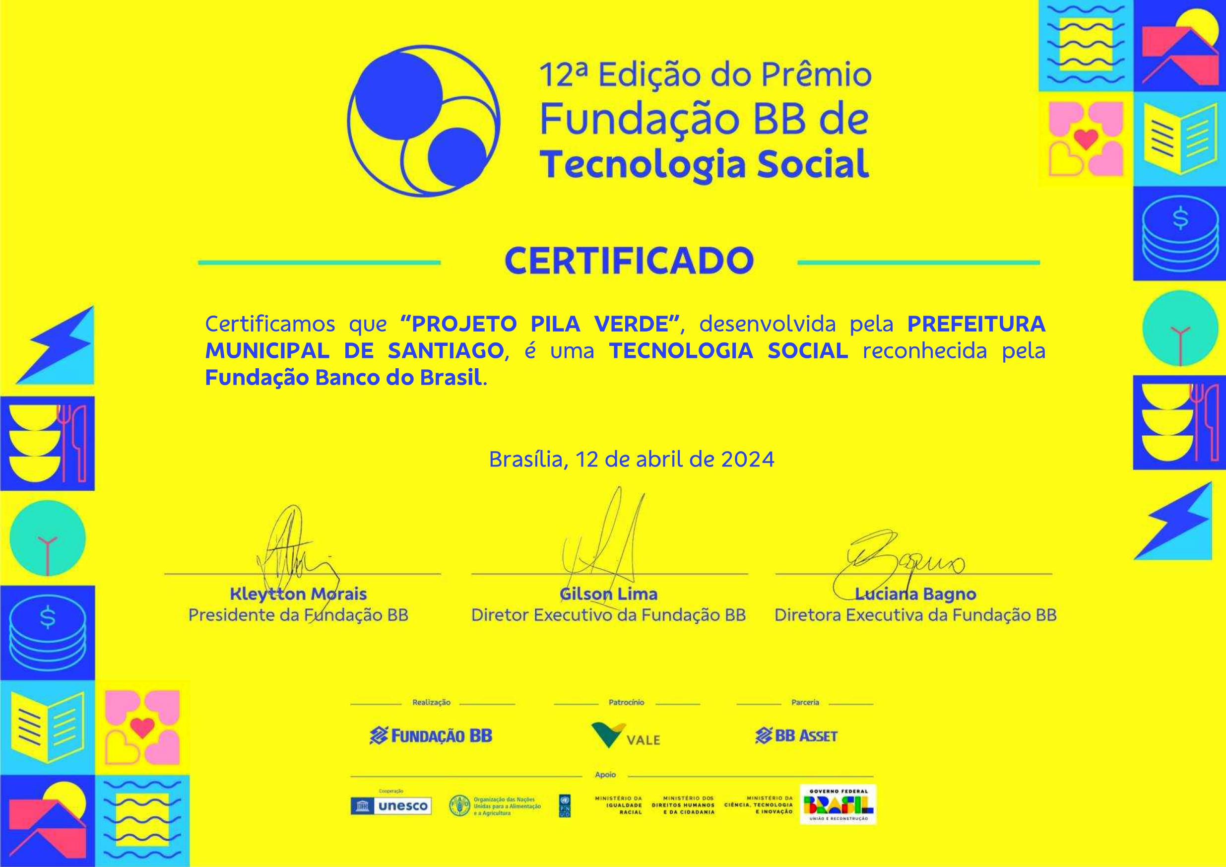 Depois de ter conquistado premiação do Sebrae do Rio Grande do Sul e ser finalista do prêmio Prefeitura Empreendedora, em Brasília (no ano de 2022), o projeto Pila Verde conquistou um novo reconhecimento nacional. Desta vez, por meio da Fundação Banco Brasil, que reconheceu o Pila Verde como uma tecnologia social, na 12ª edição do prêmio Fundação BB de Tecnologia Social.