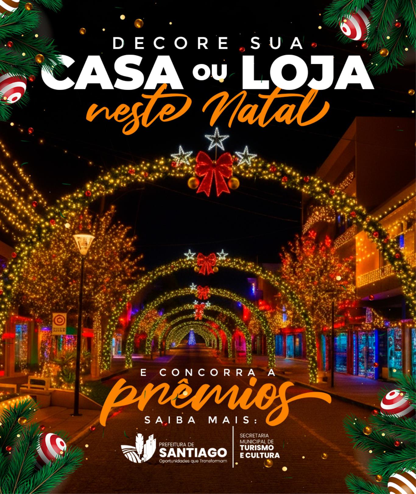 Que tal fazermos do Natal 2025 mais encantador em Santiago? Participe da campanha "Santiago: a Querência do Natal", decorando sua casa ou loja e concorrendo a prêmios. Para participar, preencha o formulário online colocando seu nome, endereço e indicando se quer concorrer como loja ou como residência.